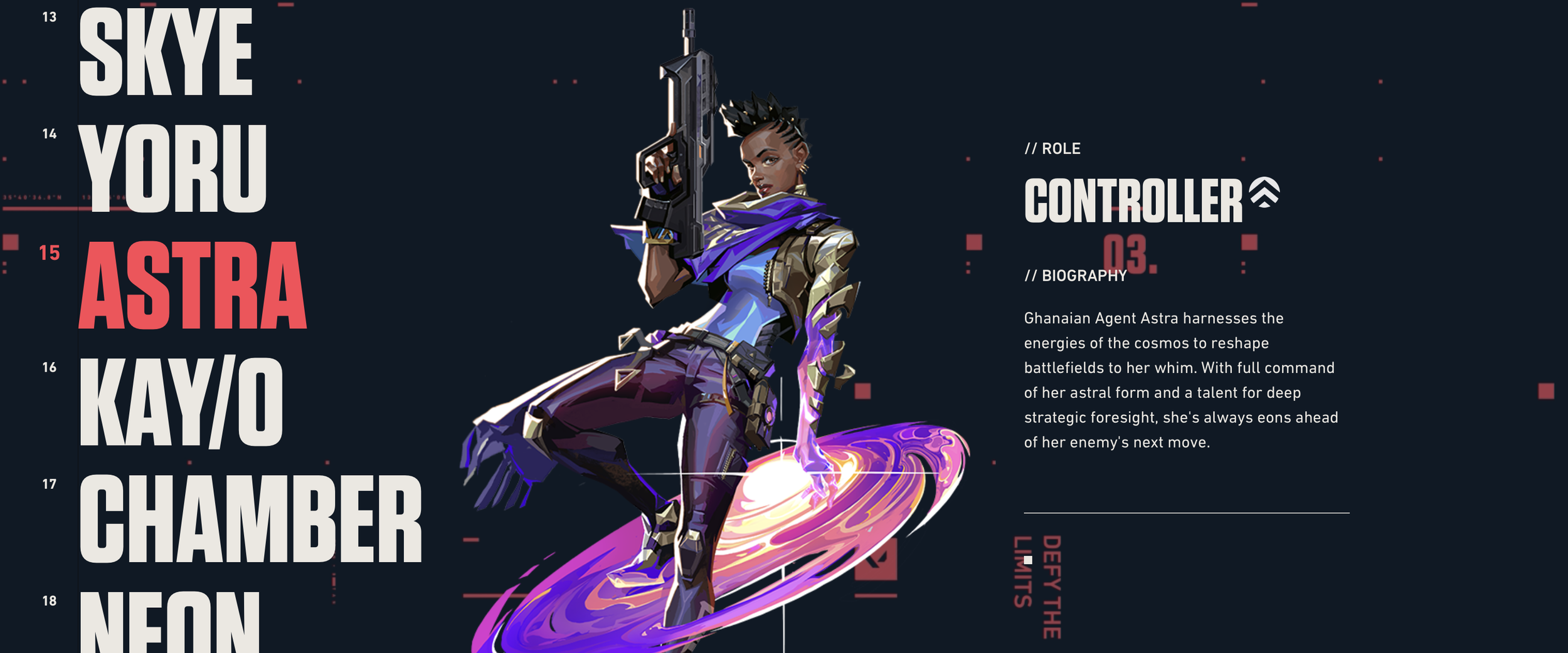 Introduce VALORANT players to the game’s newest agent, Astra - a Ghanian Controller who taps the power of the cosmos to enter astral form and gain strategic foresight for her team.